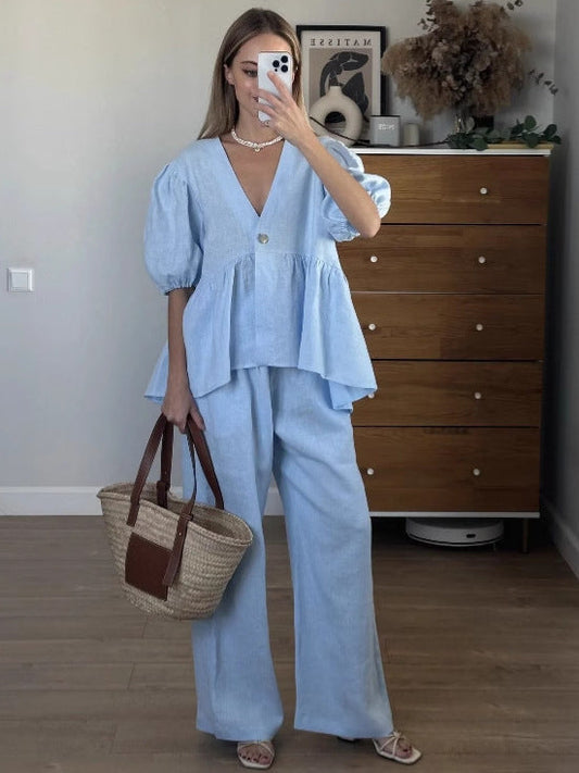 Damen Set Mit Asymmetrischer Bluse Und Weiten Hosen